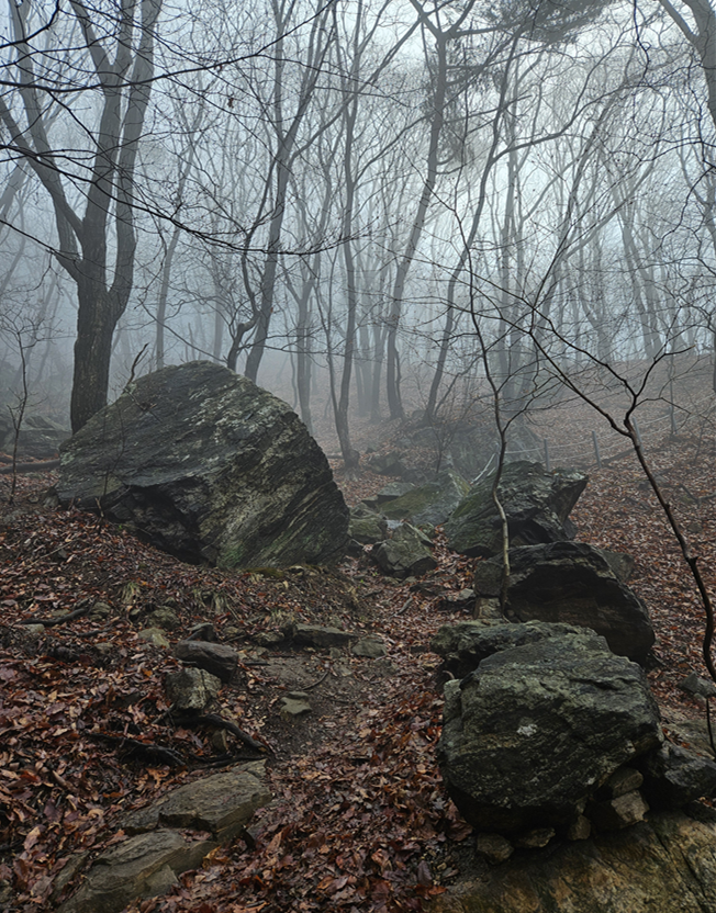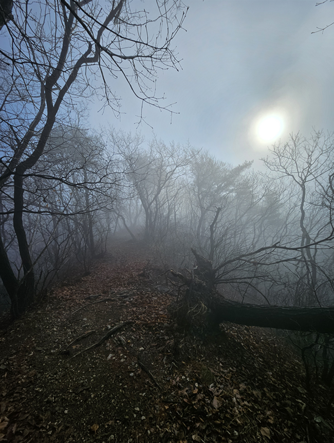 이른 아침 안개를 뚫고 오르면서 보이는 바위와 나무들이 영화에 한장면 같은 느낌도 들었음.
